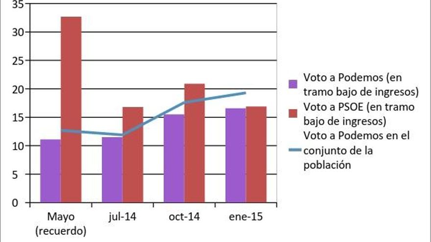 Si atendemos a los datos que tenemos de recuerdo de voto, en la encuesta postelectoral de 2014, el recuerdo de voto a Podemos en el tramo de ingresos bajo era, en términos relativos, un 12,6% más bajo que su media total. Recordaban haberlo votado un 11,1% de personas en el intervalo bajo de ingresos (hasta 900 euros mensuales), por un 12,7% en el conjunto de la población entrevistada. En julio, ya en un sondeo que indagaba directamente sobre lo que votaría la gente en unas supuestas elecciones generales, la desviación era del -3,4%. Tenían intención de votarlo el 11,4% de personas con ingresos inferiores a 900 euros mensuales (y el 11,9 de todos los votantes). En octubre de 2015, el voto de Podemos en el tramo de ingreso bajo se apartaba de la media en un -11,1%. En enero de 2015 en un -14%.