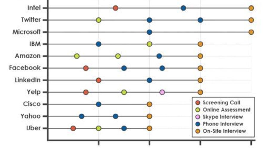 Los gigantes no seleccionan candidatos de una sola vez. Con la única excepción de Cisco y su proceso de selección más sencillo, los candidatos de las otras 12 empresas tecnológicas analizadas por GetVoiP tuvieron que someterse a un mínimo de tres fases para intentar conseguir el puesto, desde la tradicional llamada telefónica a la evaluación 'online' (como en el caso de Twitter o Amazon), conversación por videollamada o entrevista presencial. Los aspirantes a trabajar en Amazon, Facebook, Apple, Google, Intel, Twitter o Uber han de superar al menos cuatro fases para demostrar su valía.