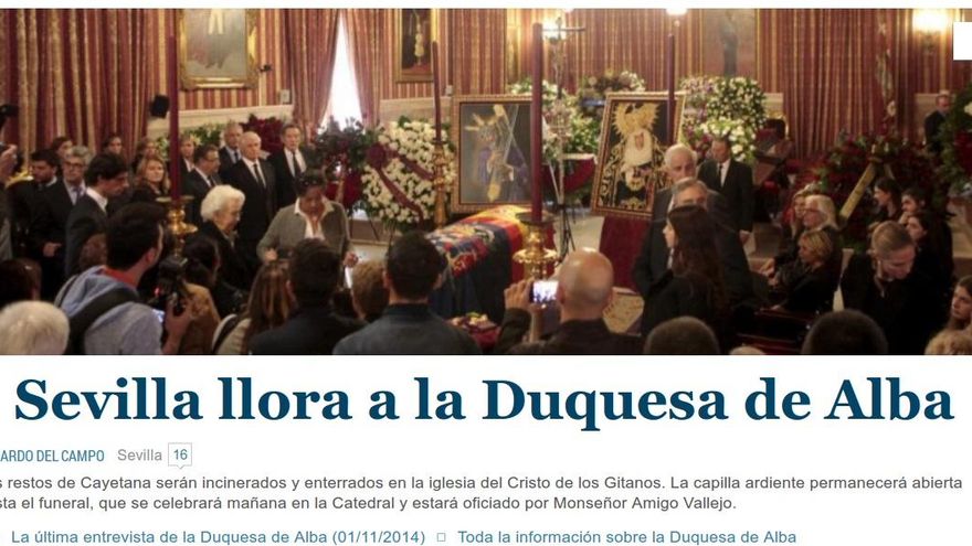 Una vez más, los medios deciden qué es lo que piensa, opina o siente toda una sociedad. En este caso titularon “Sevilla llora a la Duquesa de Alba” (El Mundo, 20 de noviembre). No sabemos si es que las ciudades lloran o es que comprobaron que lloraron todos los sevillanos y no encontraron a ninguno que no llorara.