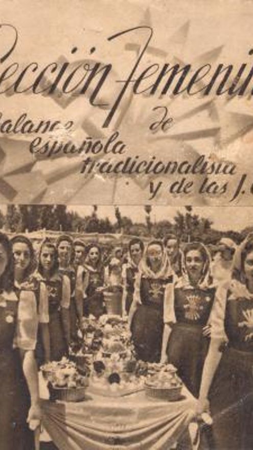 La muestra, que estos días gozaba de una notable afluencia femenina en un 98%, abunda en cómo se pasó de una cierta liberalización en los años treinta, como refleja la portada de Mundo gráfico sobre los campeonatos nacionales femeninos de 1932 en la que se ve a una mujer lanzando la jabalina, a cómo en los cuarenta todo se nutrió de estampas religiosas, libros de labores para la mujer e incluso muñecas con el uniforme de Falange y las JONS. Porque las niñas, eso sí, tenían que jugar con muñecas.