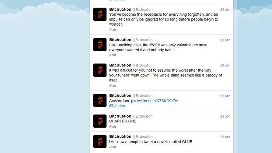 El País publicó el 12 de mayo la noticia de que el cineasta Steven Soderbergh acomete desde su cuenta @bitchuation la “novela” (entrecomillemos hasta ver cómo termina el asunto) Glue, de la que ya ha escrito catorce capítulos. ¿Es esto suficiente para suscitar curiosidad y sobre todo extrañeza? Puede ser, pero aún hay más: algunas editoriales underground de Estados Unidos llevan un tiempo publicando avances de varios libros a razón de 140 caracteres por entrega. La nueva novela folletinesca bien podría hacerse eterna.