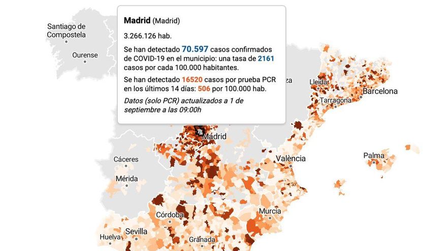Qué sabemos sobre la mortalidad que ha habido en España durante el primer verano de la pandemia Belén Remacha / Raúl Sánchez Mapa ─ Los casos de COVID-19, municipio a municipio, en Madrid, Catalunya y las comunidades que publican datos