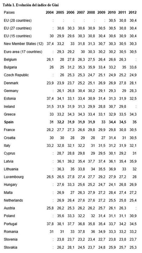 En dicha tabla se observa el indicador más habitual de desigualdad económica, el índice de Gini, una cifra que compara la distribución de la renta de un país con la situación teórica en la que la distribución fuese en la misma proporción para todos, en cuyo caso el indicador tomaría el valor 0. Tomaría el valor 1 si una persona (o familia) tuviese toda la renta y el resto, ninguna. Los valores conocidos históricamente para este índice oscilan entre 0,2 y 0,7, aproximadamente.