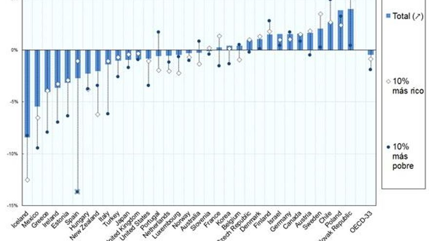 Pero por países apreciamos que los hay con mejoras de poder adquisitivo, tanto en los hogares más ricos como en los más pobres, destacando Chile, Polonia o Eslovaquia. España es de los países en los que la pérdida de poder adquisitivo es mayor, superada por Islandia, México, Grecia y Estonia.