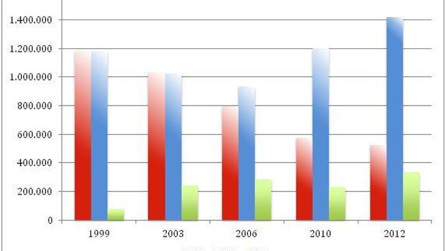 Gráfico 1. Votos absolutos a PSC, CiU e ICV en las elecciones autonómicas