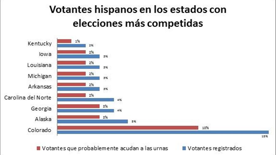 El voto “latino” tiene más influencia en las elecciones presidenciales que en las legislativas que se celebran hoy. Por sus características geográficas tiene poca injerencia en la formación del Congreso. La razón es que se trata de un electorado muy minoritario en la mayoría de los estados. Como se observa en el gráfico tan sólo Colorado, con el 15% de los electores registrados como “de origen hispano”, tiene una población de ascendencia latinoamericana que podría resultar significativa en las elecciones. Además, el electorado latino tiene un porcentaje de participación significativamente menor que los otros grupos de electores, especialmente en las elecciones legislativas.