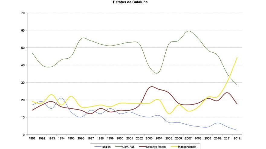 La segunda interpretación se sustentaría en la hipótesis del cambio, es decir, en que se ha producido un incremento del apoyo a Catalunya como estado independiente por parte de los catalanes. Una circunstancia que se ha puesto de manifiesto en los barómetros del Centre d’Estudis d’Opinió desde el año 2005 a la actualidad, en los que se observa un apoyo creciente a la preferencia por un estado independiente.