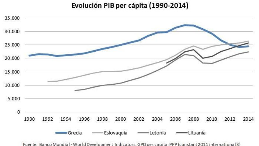 En una lúcida entrada publicada en su blog, Branko Milanovic (exjefe de investigación del Banco Mundial) intenta dar respuesta a esta cuestión a través del siguiente razonamiento, que intentaré interpretar: gracias a la teoría económica podemos medir, a través de una función, el bienestar de los distintos países. Esta función depende positivamente del nivel de renta, por lo que cuanto mayor sea ésta, mayor será el bienestar de dicho país. Siguiendo esta intuición, un país con una renta per cápita más alta que el resto disfrutará, por tanto, de un mayor bienestar. Ahora, imaginemos una situación en la que un país relativamente más pobre debe realizar una transferencia de renta a un país más rico. ¿Tiene lógica que dicha decisión genere tensiones internas? ¿Es justo que los habitantes de un país más pobre paguen parte de la deuda contraída por un país más rico? Bueno, esto es lo que ha sucedido, precisamente, entre Letonia, Lituania o Eslovaquia (países relativamente más pobres), y Grecia (país más rico). Observando el gráfico inferior podemos comprobar que desde 1990 y hasta 2013, la renta per cápita del país heleno ha sido muy superior a la del resto del grupo de países comparados.