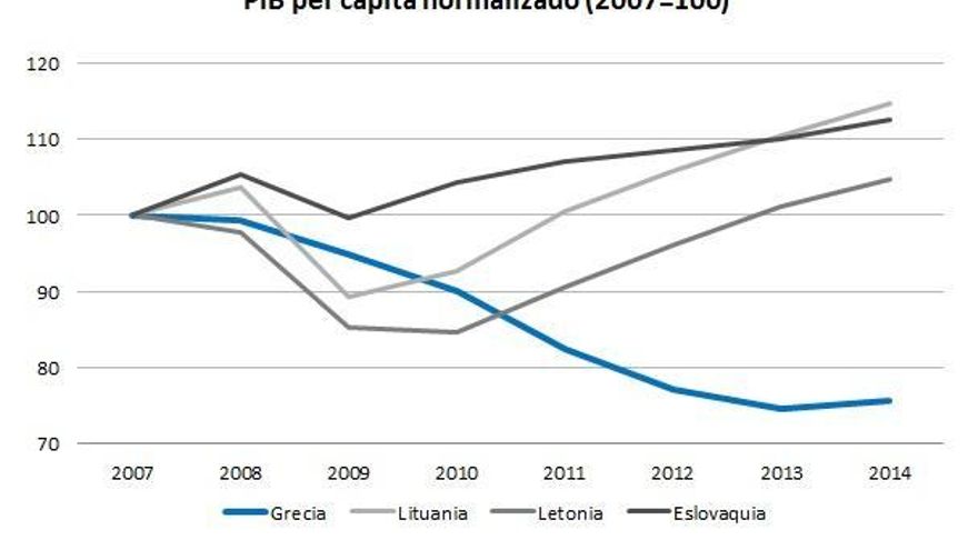 De la misma forma se evidencia en el gráfico que, en la actualidad, y como consecuencia de la enorme caída del PIB per cápita en Grecia, tanto Eslovaquia como Lituania la han sobrepasado en renta. Es el momento de recordar aquí que estos dos últimos países, junto a Letonia, emprendieron profundas reformas económicas e institucionales con el objetivo de cumplir las condiciones de adhesión al euro que se habían marcado desde instancias europeas. Teniendo en cuenta lo expuesto, sería justificable la posición adoptada por estos países relativamente más pobres. Mientras ellos, pensarán, “han hecho los deberes”, otros “quieren darse un festín”, como declaró la presidenta lituana tras una reunión extraordinaria del eurogrupo. Y sobre todo: se ven forzados a realizar una transferencia de renta a un país con un nivel de vida históricamente superior.