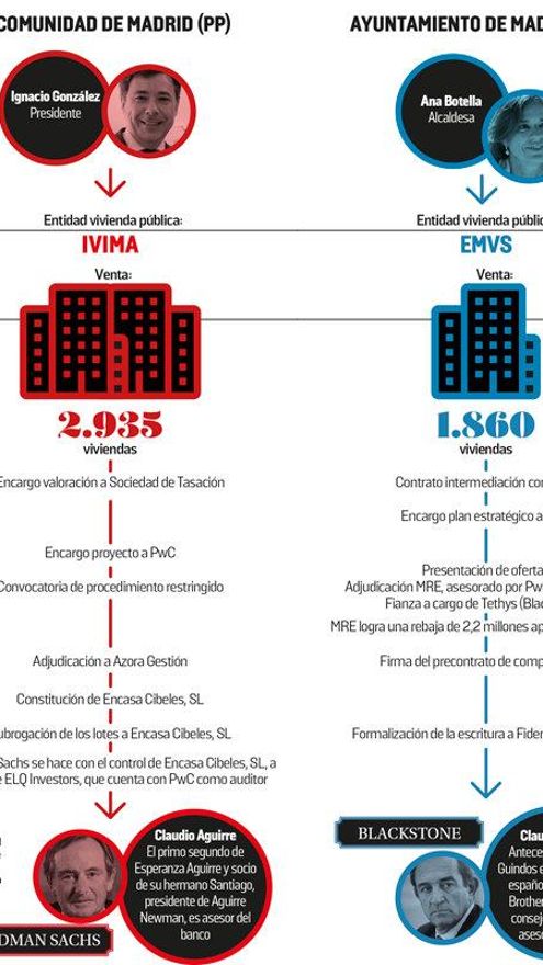 La dinámica de los dos concursos simultáneos fue muy parecida, con una selección de fondos finalistas restringida y la rápida adjudicación a ofertantes españoles que resultaron ser meros intermediaros: Azora Gestión en la Comunidad de Madrid y Magic Real Estate en el concurso del Ayuntamiento. Inmediatamente después de la adjudicación y sin que estuviera previsto en el pliego de condiciones —como subraya en ambos casos la Cámara de Cuentas—, los lotes de viviendas adquiridos pasaron a manos de Encasa Cibeles y Fidere, respectivamente,  la primera en seguida bajo control de Goldman Sachs y la segunda de Blackstone, con lo que dos de los actores más importantes de Wall Street pasaban a ser propietarios de parte importante del parque de vivienda social de Madrid.