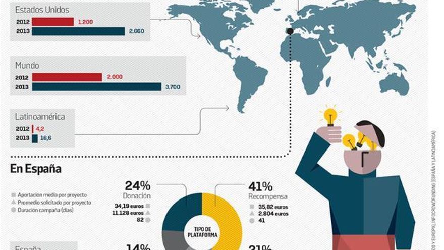 La crisis que arrancó en 2008 ha secado las vías tradicionales de acceso a la financiación, pero ha supuesto un formidable acelerador de un fenómeno que crece a un ritmo de tres dígitos al año y que solo en 2013 movió ya 3.700 millones de euros en el mundo (1), 19 de ellos en España (2) y 16 en América Latina. Estas cifras, ya importantes, son una broma en comparación con lo que se avecina: un estudio encargado por el Banco Mundial estima, aplicando un modelo muy conservador, que el crowdfunding moverá un mínimo de 70.000 millones de euros en 2025 (3).