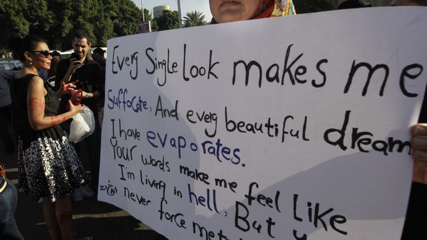 Tampoco en las calles están seguras las mujeres. Si la “Revolución del 25 de Enero” puso la plaza Tahrir de El Cairo en boca de todo el mundo, ésta se ha convertido ahora en un lugar de connotaciones infames, por las agresiones sexuales de la multitud a las manifestantes. Una mujer que sobrevivió a una de estas agresiones en la plaza, el 25 de enero de 2013, la describe así: