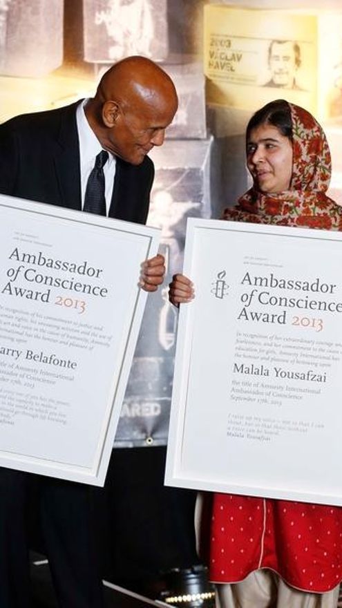 Agradezco a Amnistía Internacional su constante actividad de campaña para proteger los derechos humanos y que me haya concedido este premio por nuestra campaña mundial en favor de la educación de las niñas. Me siento realmente honrada de compartir hoy este galardón con el rey, no sólo del Calipso, sino de las campañas en favor de los derechos humanos en todo el mundo. Le admiro profundamente, señor Belafonte.