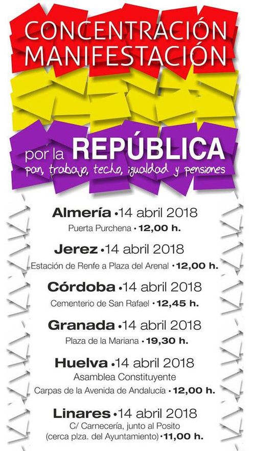 Las concentraciones centrales están convocadas bajo la consigna “Por la República, pan, trabajo, techo, igualdad y pensiones” y un hashtag para mover en redes sociales: #AndalucíaPorLaRepública. Porque “no hay garantía de igualdad de derechos sociales y democráticos sin República”, como defiende la Coordinadora Andaluza de Organizaciones Republicanas. Este 14 de abril celebra además un cumpleaños: los 12 años de existencia del proyecto Todos (…) los nombres.