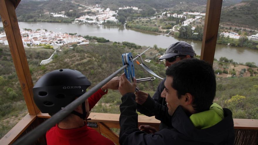 En barco, en coche o en autobús. Hasta ahora eran las opciones para cruzar el Guadiana y pasar a Portugal desde el oeste de Huelva, usando tanto el servicio en barco por el río o los puentes sobre el Guadiana. Pero desde hace no demasiado tiempo hay una opción que ya ha sido usada por cientos de personas, y que, desde luego, es original a la par que pionera: una tirolina.