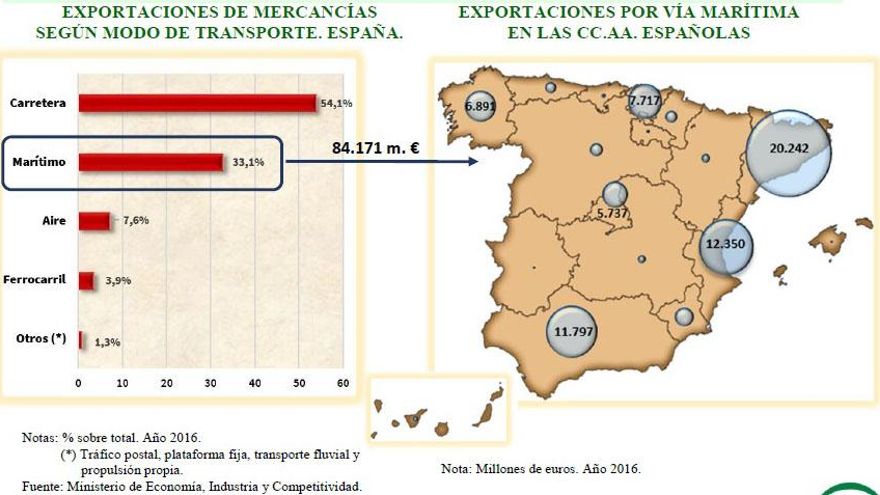 La base de datos de comercio con el extranjero del Ministerio de Economía, Industria y Competitividad ofrece información sobre los medios de transporte usados en las importaciones y exportaciones de España y sus comunidades autónomas, que básicamente son camión, barco, avión y ferrocarril. De este modo, pese a que en 2016 las exportaciones de productos hacia el extranjero sumaron 254.530 millones de euros, más de la mitad fue por carretera, mientras que por vía marítima supusieron la tercera parte. En concreto, en 2016, las exportaciones de mercancías de España hacia el extranjero por vía marítima sumaron 84.171 millones de euros, de los que prácticamente la cuarta parte correspondieron a Cataluña, seguida por la Comunidad Valenciana y, en tercer lugar, Andalucía.