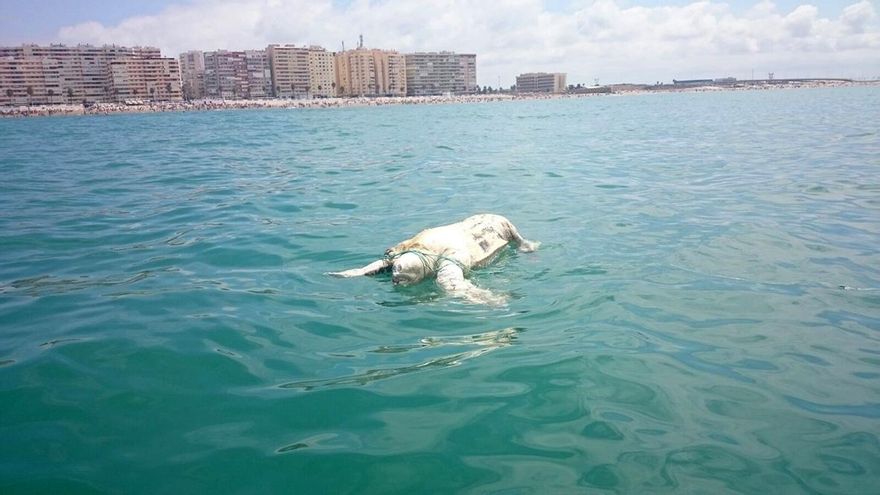 Las olas acercaban el bulto blanquecino a la orilla hasta que el periodista especializado en medio ambiente nadó a su encuentro. “Me acerqué nadando y cuando estaba a escasos metros me quedé un poco paralizado porque se me pasaron muchas cosas por la cabeza, si podía ser un hombre ahogado, un fardo de droga o un animal o restos de una barca”. Cuando comprobó que era una tortuga marina, tiró de los cabos atados a su cuerpo y la condujo a tierra.