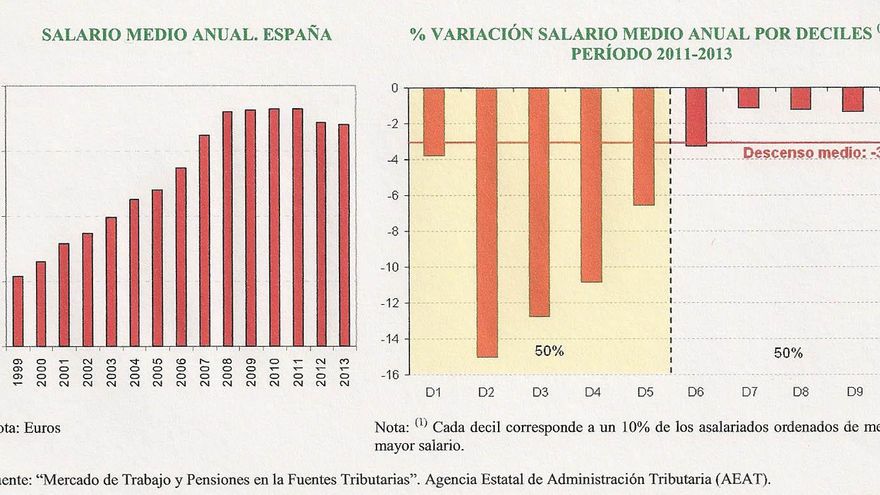 La estadística de Hacienda muestra en 2013 hubo en España 16.682.061 asalariados (incluidos los que recibieron prestaciones salariales todo el año, y los que sólo lo hicieron una parte de él, y el paro o pensiones el resto). Y que el salario anual medio fue de 18.505 euros. Implica que el salario medio se redujo por segundo año consecutivo, con un descenso acumulado del 3,1%. (Ver tabla izquierda)