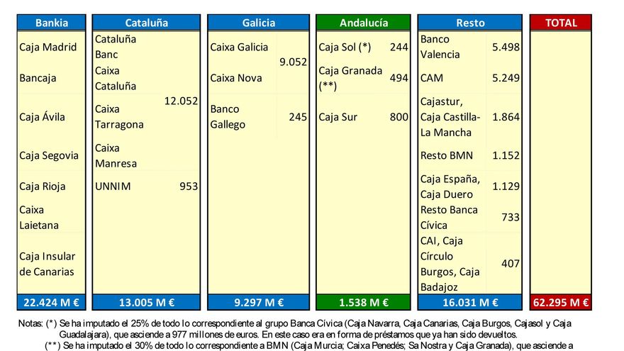 La cifra es llamativa si se tiene en cuenta que fue desde 2009 cuando se evidenció la crisis en el sector por los desequilibrios a los que había llevado el boom de créditos sobre todo para hipotecas de viviendas. Como solución se activó el Fondo de Reestructuración Ordenada Bancaria (FROB), que ha aportado en los últimos años un total 54.353 millones de euros de fondos públicos, a los que se suman los 7.942 del Fondo de Garantía de Depósitos de Entidades de Crédito (Fgdec).