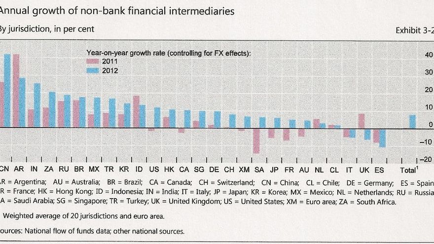 Durante 2012 la banca en la sombra creció en la práctica totalidad de los países, con tres excepciones, Reino Unido, Italia y, la mayor caída de todas, España. Así, mientras que en su conjunto el crecimiento medio de la intermediación financiera extra bancaria global se disparó desde un tímido 0,6% en 2011 a un espectacular crecimiento del 8,1% de 2012, en España, como consecuencia de su profunda crisis, disminuyó un 11% con respecto al año anterior.
