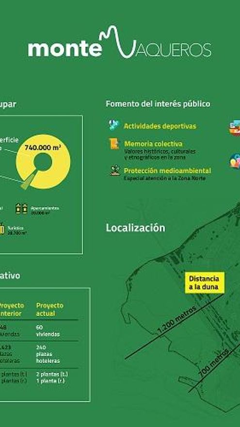 El proyecto, como también ha informado este periódico, constará de 60 viviendas y 240 plazas hoteleras, “lo que permitirá rebajar la densidad residencial a menos de una vivienda por hectárea”. Así, sobre un terreno de 800.000 metros cuadrados, Montevaqueros ocupará 61.000, quedando el resto, libre para el uso público, argumentan los promotores.