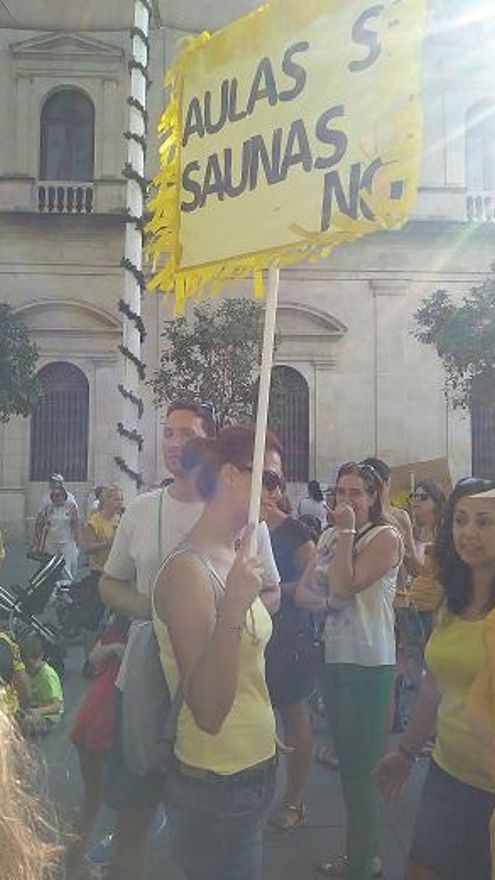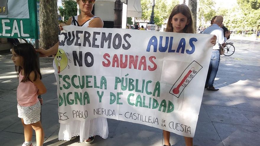 Este mismo jueves, padres y madres del CEIP Huerta de Santa Marina, del distrito Casco Antiguo, se concentraron en protesta por las situación del centro, donde los alumnos están obligados a dar clase a temperaturas superiores a 35 grados, según denuncian. Las familias, portando ventiladores, anunciaron que iban a comprar e instalar una aparato de aire acondicionado. “Al parecer está habiendo muchos sangrados de nariz y algún golpe de calor entre el alumnado”, apuntaban.