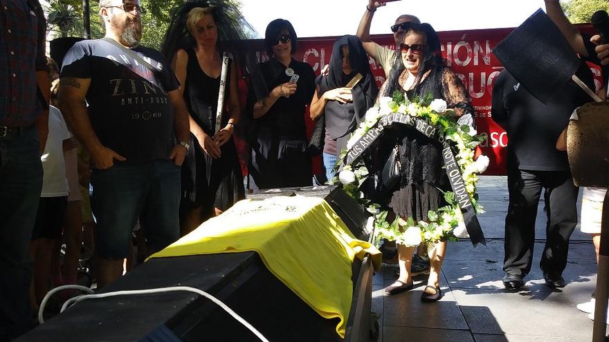 “Pobre ley, demasiado joven para morir”. Asociaciones de Madres y Padres de Alumnos de Andalucía han asistido en Sevilla al funeral simbólico de la ley de bioclimatización en los centros educativos, que en febrero del año pasado inició su tramitación parlamentaria. La asociación 'Escuelas de Calor. Aulas sí, saunas no', que reúne a 200 AMPAS de Sevilla y provincia, ha convocado este domingo frente al Ayuntamiento hispalense a cerca de un millar de familias que han exigido la instalación de climatización en los centros educativos para combatir las altas temperaturas que los últimos años marcan el comienzo y final de los cursos escolares.