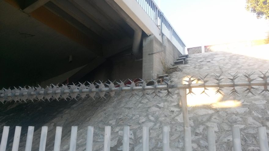 Junto al cerramiento de la planta de Emasesa con concertinas, muy cerca, elementos punzantes rematan desde hace años el vallado de los bajos del puente de la Barqueta. Hace unos años, el Ayuntamiento de Sevilla colocó vallados de postes en los bajos de algunos puentes del paseo fluvial para disuadir a los sin techo de dormir, pero este es el único punto en el que además se ha añadido una protección extra con elementos punzantes como se aprecia en la fotografía de abajo. Todo ello en un paseo fluvial inaugurado en vísperas de las últimas elecciones municipales y por el que cada día circulan decenas de personas a pie o en bicicleta.