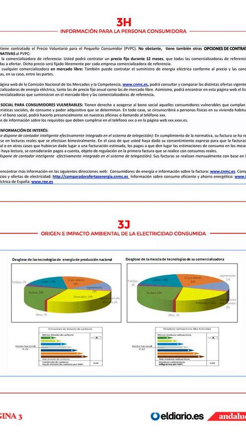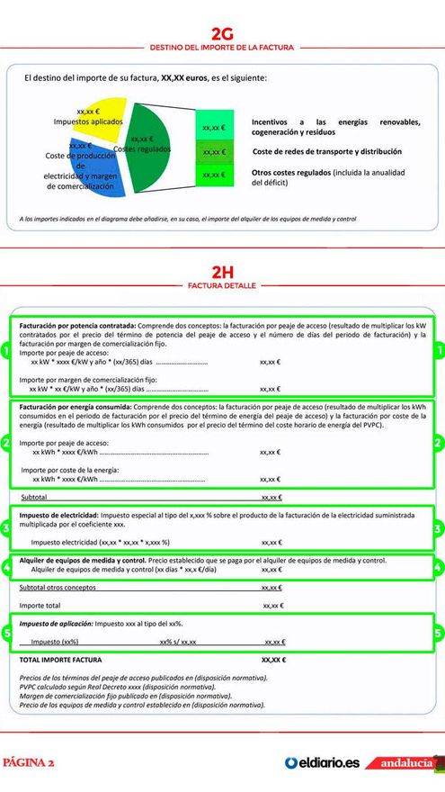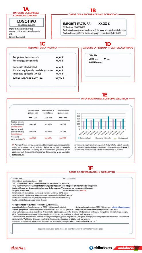 Tomando como referencia el modelo de factura de electricidad del Ministerio de Energía, Turismo y Agenda Digital, vemos que la factura la componen una serie de áreas distribuidas en varias páginas.
