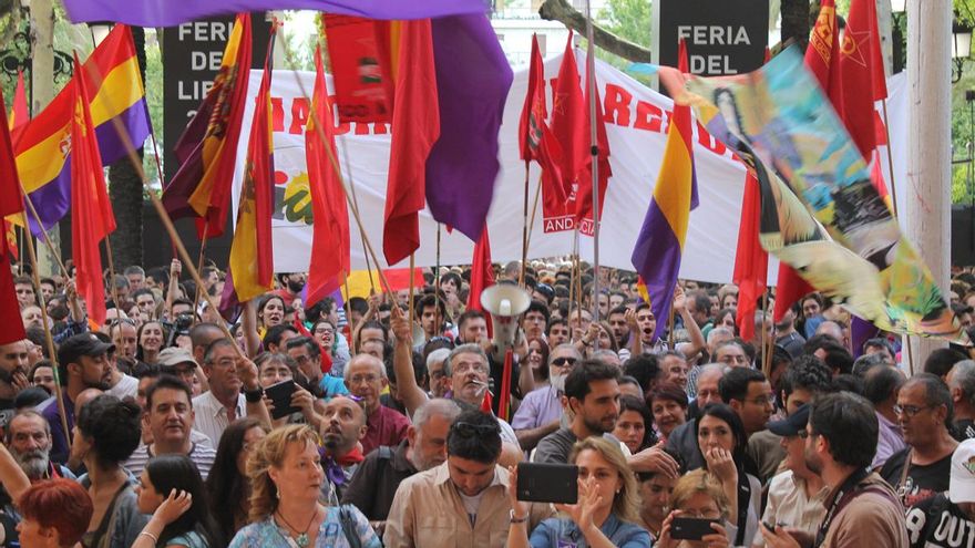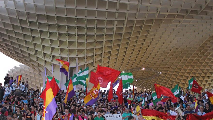 Caras de felicidad, risas, proclamas y cánticos contra la monarquía y a favor de la república, banderas, camisetas, pancartas... Como si las miles de personas que se concentraron en las calles de Sevilla esperasen la sorpresiva propuesta de abdicación por el rey Juan Carlos I. Como si lo tuviesen todo preparado para un día así. “Es el momento de iniciar un proceso constituyente”, decían algunos. “Queremos un referendum, queremos votar”, gritaban otros. “Sí se puede”, atronaba a cada rato.