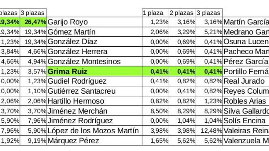 Como puede observar en la tabla, en caso de empate, si usan ese sorteo para asignar una vacante, Álvarez Solano tiene, con su sorteo, más del 19% de las papeletas, mientras que yo, Grima Ruiz tengo menos del 1%, un 0,41%. Y en el caso de que quedasen 3 vacantes y Álvarez Solano y yo estuviésemos empatados por puntos, él tendría para su sorteo, el 26,47% de las papeletas y yo seguiría con el 0,41%. Esto quiere decir que realizamos un sorteo entre los dos y a el le dan 6.456 papeletas y a mí, 100. ¿De verdad le parece justo? O peor, para una única vacante, mire cuántas posibilidades tiene, por ejemplo, Cañete Molero: NINGUNA.