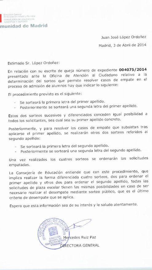 En este caso, en el caso de los sorteos para resolver empates en el proceso de admisión de alumnos de la Comunidad de Madrid, uno de los profesores del instituto afectado, matemático, dirige una queja, con número 004075/2014 a la Subdirección General de Atención al Ciudadano de la citada comunidad, atencionalciudadano@012.madrid.org.
