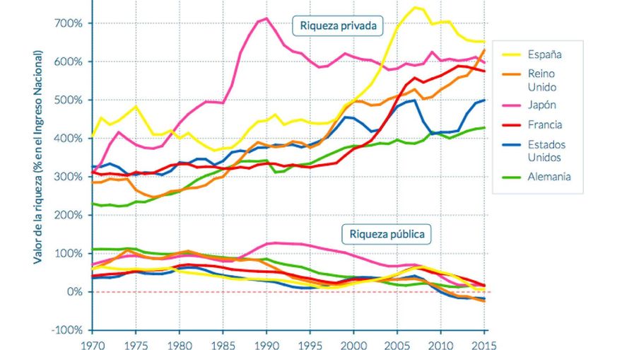 Pues bien, desde los años ochenta se observan transformaciones de gran tamaño en la propiedad de la riqueza en todos los países, salvo excepciones como Noruega. Existe un traspaso de la riqueza del dominio público al privado, hasta el punto de que la riqueza pública se ha hecho negativa o cercana a cero en los países ricos al superar las deudas a los activos. Pero aunque se trata de una tendencia global, hay algunos países que destacan especialmente como España, donde el despegue de la curva coincide bastante con la llegada del Partido Popular al poder en 1996, la entrada en el euro y el inicio de la burbuja inmobiliaria.