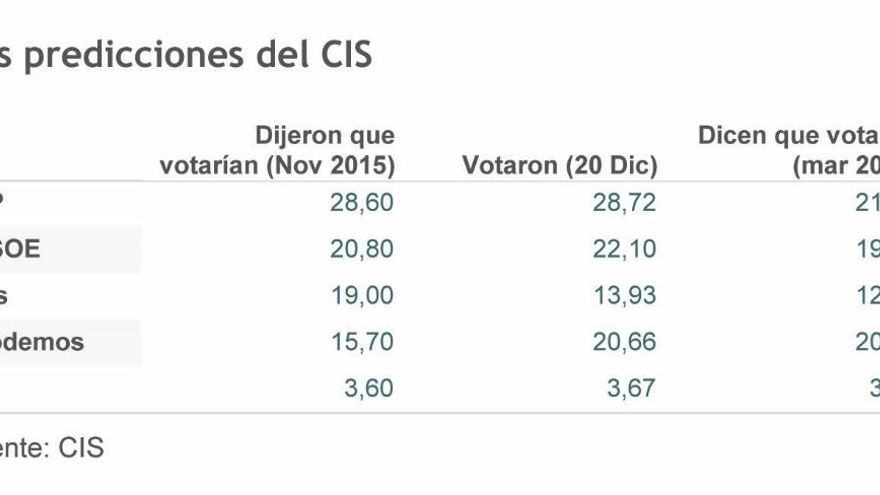 2. Un sondeo que confirma lo que ya sabíamos: que la gente miente (o no tiene clara la verdad) y que las encuestas se equivocan (o cocinan a fuego fuerte). El sondeo hecho público ayer es de los llamados “postelectorales”. Es decir, el CIS ha vuelto a entrevistar a las mismas personas a las que preguntó en noviembre de 2015, un mes antes de las elecciones. Para ser exactos, a una selección de ellas (6.200). En definitiva: los expertos en demoscopia vuelven a apoyar sus resultados en los mismos ciudadanos que en aquel momento dijeron -o el CIS interpretó que dijeron- que Ciudadanos le sacaría casi 20 diputados de ventaja a Podemos (en realidad, pasó al revés).