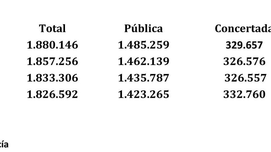 En los de este martes, figuran 1.826.592 escolarizados en estos estudios para el curso 2017-2018. En los del año pasado, que todavía puede consultarse en las referencias del Consejo de Gobierno, figuraban 1.833.306. Paradójicamente, en una comunidad autónoma que hace gala de la educación pública, esta bajada se concentra en sus propios centros de enseñanza porque tendrán en el nuevo curso 1.423.265 matriculados frente a los 1.435.787 que se cuentan en los datos del año pasado, e igualmente en el listado de referencias del Consejo de Gobierno. O sea, 12.162 menos.