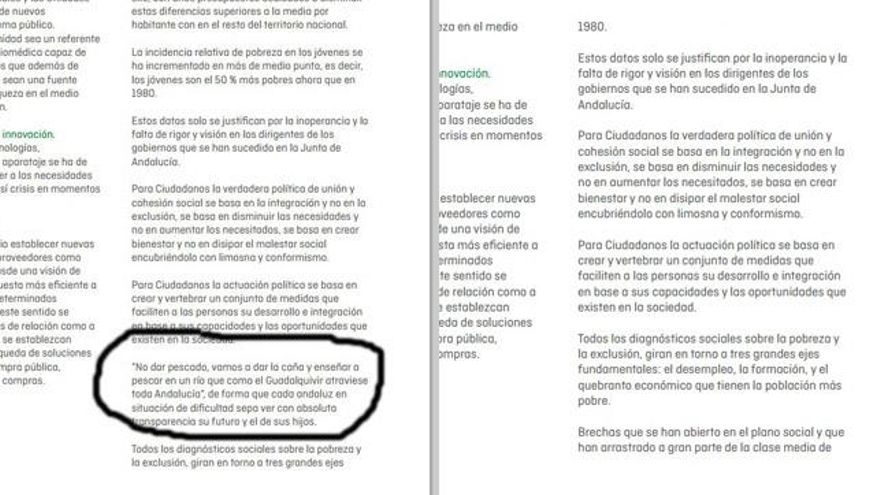 Hasta hace unos días, la frase que encabeza esta información se podía leer en el programa electoral de Ciudadanos, que se cuelga en su web y que este periódico analizó recientemente con sus aspectos más destacados. La mención a “enseñar a pescar” se incluía en el apartado 3.3. ('Los Servicios Sociales, la verdadera política de unión y cohesión social'), después de apuntar una serie de datos que “solo se justifican por la inoperancia y la falta de rigor y visión en los dirigentes de los gobiernos que se han sucedido en la Junta de Andalucía”.