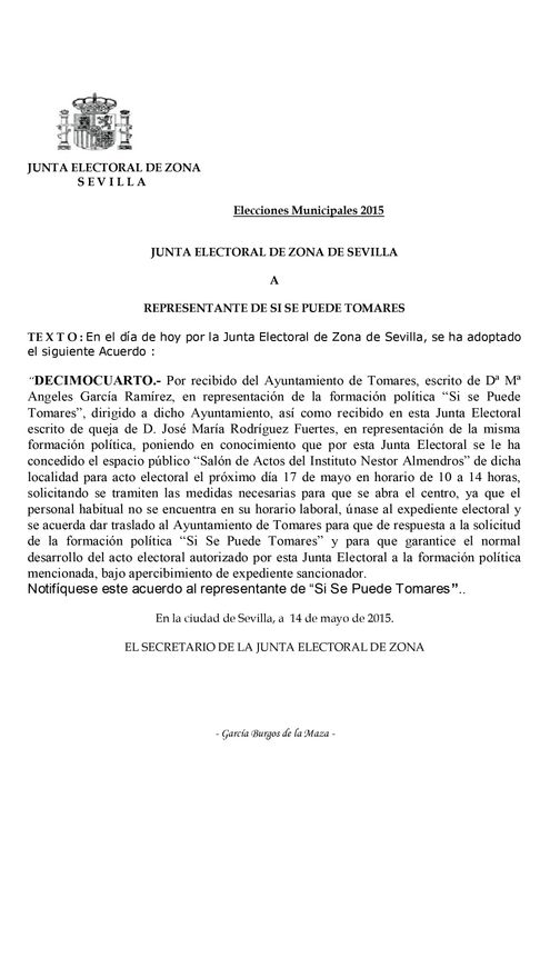 Ahora, y ante estas denuncias, la Junta Electoral en Sevilla acuerda “la apertura de expediente sancionador” al alcalde del PP y al secretario municipal por estos “problemas” causados a Sí Se Puede. La JEZ requiere además que de cara al mitin de Sí Se Puede Tomares del día 22, “facilite sin excusa ni pretexto el acceso al punto de luz para la celebración del acto, removiendo cuantos obstáculos existan”. La agrupación de electores, por su parte, avisa que tiene reservada la plaza del Ayuntamiento para celebrar un acto el día 22 y que desconoce si contará con conexión al abastecimiento energético.