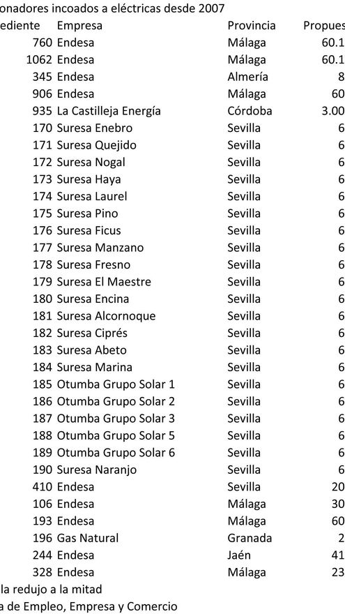 De esos 32 expedientes sancionadores [relación completa más abajo] se han pagado una multa impuesta en 2012 a Endesa por fallos de suministro en Málaga, y que de 300.000 euros pasó a ser de 150.000 por sentencia, y otra de 20.000 el mismo año a Gas Natural en Granada. De los dos de 2007, se reconoce que “no hay datos”, mientras que el grueso de ellos (26) están en proceso de recursos.