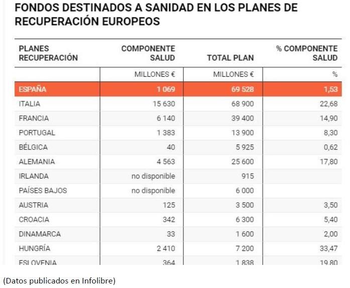 Resumiendo, pues, nos encontramos ante un posible escenario de crisis generalizada de los servicios sanitarios, tanto públicos como privados, sólo que los servicios sanitarios públicos tienen una “perspectiva decadente” a raíz de los insuficientes presupuestos y medios que se están arbitrando para reforzarla. Sólo 1.069 millones de los 70.000 de los fondos europeos de reconstrucción van a ir al reforzamiento de la sanidad pública de nuestro pais (“El 75% se dirigirán a comprar equipos de alta tecnología”). Mientras, Italia, con otros 70.000 millones, dedicará 15.000 a sus servicios sanitarios públicos.