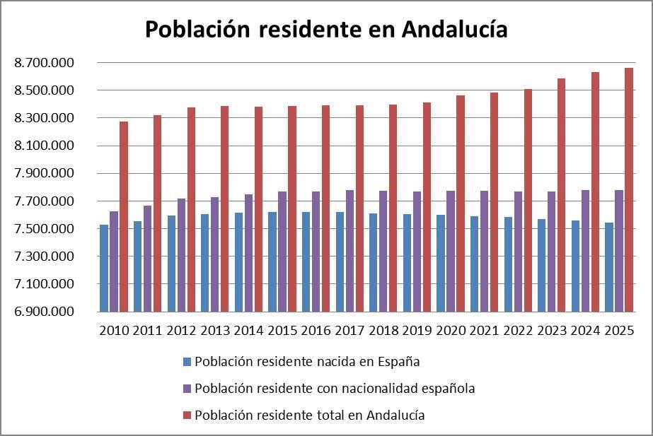 El crecimiento de la población andaluza desde 2010 hasta 2025 se debe a la afluencia de inmigrantes. Sin ellos la población andaluza nacida en España (entre los que se encuentran los hijos de los inmigrantes ya nacidos aquí) estaría estancada: 7.530.879 en 2010 y 7.543.739 en 2025.