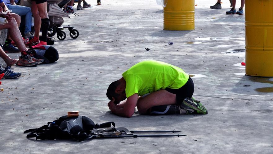 La pájara no avisa, solo llega. Cristina Morán ha sufrido un golpe de calor. Ha hecho caso a su cuerpo, aunque la cabeza le dijera que podía, porque pudo el año pasado, cuando fue cuarta. “Iba dando tumbos... Iba quinta…”. En las palabras y el rostro de quien abandona hay frustración, como si fuera necesaria una justificación al hecho de no completar una prueba así. La cuesta de Chinchilla está poco después del avituallamiento. En mitad de la pendiente, un corredor tendido grita de dolor. Cuatro compañeros le rodean y le ayudan a estirar las piernas. Otros corredores le animan, le dan clorotil. Él se muerde los nudillos y vuelve a soltar un alarido. Pasan diez minutos. Y cuando se levanta, sabe que no seguirá. Cuando se da cuenta, llora como un niño. “Lo has dado todo”, le dicen sus compañeros. No cae quien lo intenta, le dicen. Lo abrazan y él vuelve al punto de avituallamiento, llorando cuesta abajo. Lleva los dos bastones y casi no puede andar. El cuerpo le dijo que no veinte kilómetros atrás (“vengo arrastrándome”), pero la cabeza le pidió más. “Lo hice el año pasado… ¡Ahora tendré que volver!”, explica cuando deja de llorar.