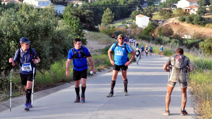 En Setenil de las Bodegas (Cádiz) está el principal puesto de avituallamiento. Los corredores pasan corriendo bajo los tajos de la calle Cuevas del Sol (donde la gente les aplaude desde El Frasquito y La Escueva y todos esos bares al abrigo de las rocas), pero deciden caminar en cuanto llega la pendiente. Han cubierto 56,5 kilómetros, y queda otra maratón. O dos medias maratones, que cada uno se hace las cuentas que más le consuelan. “Como dice el sargento cuando llevamos un kilómetro corriendo: 'Esto está acabado'”, comenta Mario. Es parte de un grupo de cinco del Regimiento Isabel La Católica. Vienen de Pontevedra, y lo notan: “Es cuestión de voluntad. A 30 grados, corriendo como animales, ¡en mi puta vida!”. Uno de ellos sufre un golpe de calor, baja lívido de la enfermería y pide reposo. Quiere seguir. Al lado, Matilde le pide a Álvaro (que ha venido de Madrid) que no se pase: “Si ves que eso… te retiras”. Las familias de los corredores locales jalonan el camino a su paso por Setenil, pertrechadas con neveras para ofrecer agua y refrescos a sus maridos, sus mujeres o sus hijos. “¡Esperemos que llegue! Porque cada vez que vemos una ambulancia, pienso que es él”, dice una señora. No sufre únicamente quien participa.