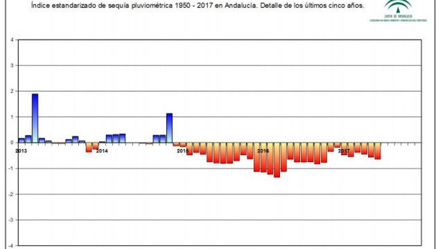 Más de dos años lloviendo por debajo de la media. Andalucía se encuentra inmersa en una sequía que se ceba especialmente con la provincias de Jaén y Almería, además de varias zonas de Málaga, Córdoba y Granada. Dicho de otra manera, “la sequía pluviométrica se consolida en el tercio oriental de la región y en el eje de los Sistemas Béticos. A las zonas más afectadas, que se situaban en el extremo nororiental de la región, se añade la comarca Penibética”. Así lo indica el último análisis de la sequía de la Junta de Andalucía.