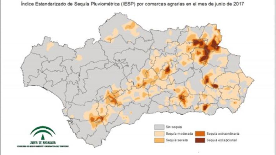 De las 26 comarcas en las que se divide Andalucía, 22 se encuentran en situación de sequía pluviométrica moderada y las 4 cuatro restantes en situación severa: Penibética (Córdoba), La Loma (Jaén), Sierra de Cazorla (Jaén), Sierra de Segura (Jaén). Según el informe de sequía de la Junta, “a corto plazo, se espera un recrudecimiento de la sequía en las comarcas que presentan una afectación severa así como en la Sierra de Cádiz y Campo de Tabernas (Almería).