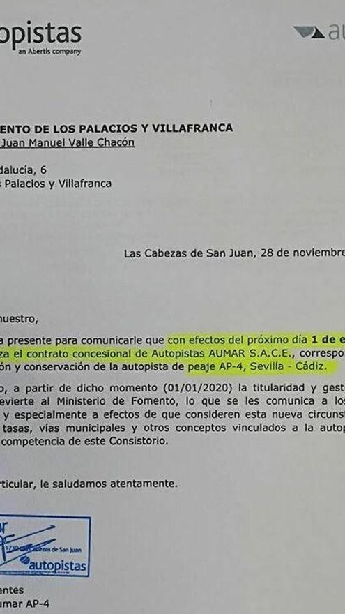 Una carta que esta primera semana de diciembre están recibiendo los alcaldes de los municipios del Bajo Guadalquivir confirma lo que muchos no terminaban de creerse: se acaba el peaje de la Autopista del Sur, la AP4 que conecta Sevilla y Cádiz y que sigue siendo de pago en su mayor parte, porque solo se liberó -hace tres lustros- el tramo desde Jerez de la Frontera a la capital gaditana. La concesionaria les informa de que su explotación y conservación de la ruta concluye el 31 de diciembre de 2019, por lo que desde el año nuevo será cosa del Ministerio de Fomento.
