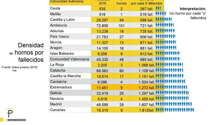 Hay que tener en cuenta que la Comunidad de Madrid no solo registra la mayor cifra absoluta de decesos por coronavirus, sino que dispone de tres veces menos hornos que Andalucía, que es el territorio con más, como puede verse en la gráfica de abajo elaborada por Panasef con datos propios y del Instituto Nacional de Estadística (INE). De este modo, pese a que en Andalucía, según los informes diarios de la Universidad Carlos III, se ha elevado la tasa de mortalidad de estas fechas por encima del 15%, en la Comunidad de Madrid se ha duplicado y más, lo que ha provocado días de espera para las incineraciones.