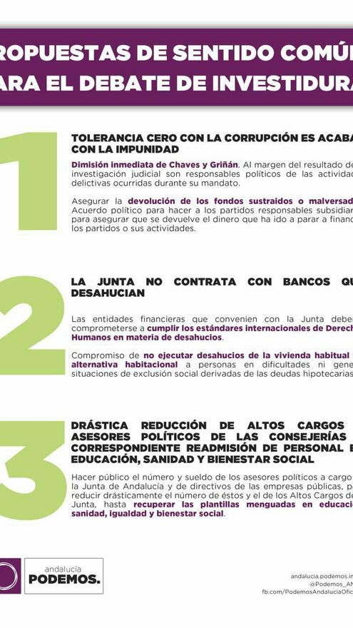 Además de las acciones, Podemos asegura que remitirá el citado documento a las distintas fuerzas políticas parlamentarias, y en particular al PSOE-A, así como a la sociedad civil, colectivos y asociaciones implicadas en el desarrollo y aplicación de las mismas (docentes, sanitarios, trabajadores de los servicios sociales, organizaciones antidesahucios…). En ese sentido, atenderán reuniones con las fuerzas políticas y colectivos en torno a las condiciones propuestas. “Es voluntad de Podemos que dichas reuniones sean públicas tanto en su desarrollo como en sus resultados”, añaden.