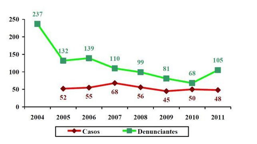 Históricamente, pese a que el número de casos se mantiene similar años tras año, la cifra de denunciantes ha mermado en los últimos 10 años, como muestra la gráfica.