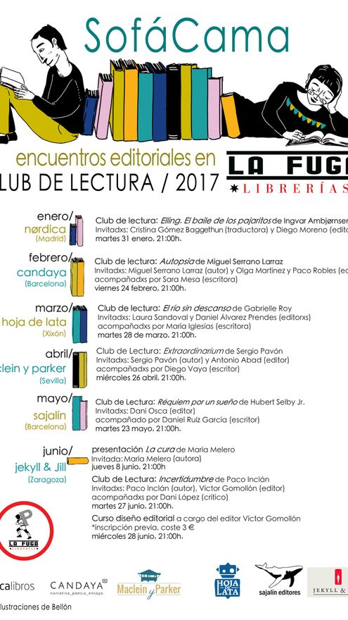 Dentro de esta filosofía de servicio público llega la iniciativa “El SofáCama de la Fuga”. Encuentros con seis editoriales independientes, uno al mes, del 31 de enero al 8 de junio, ideados por Luis Gallego y la escritora Aurora Delgado, premio Alcalá de Henares con su primera novela El corazón de Livingston y finalista del Nadal 2017 con Curva (inédita).
