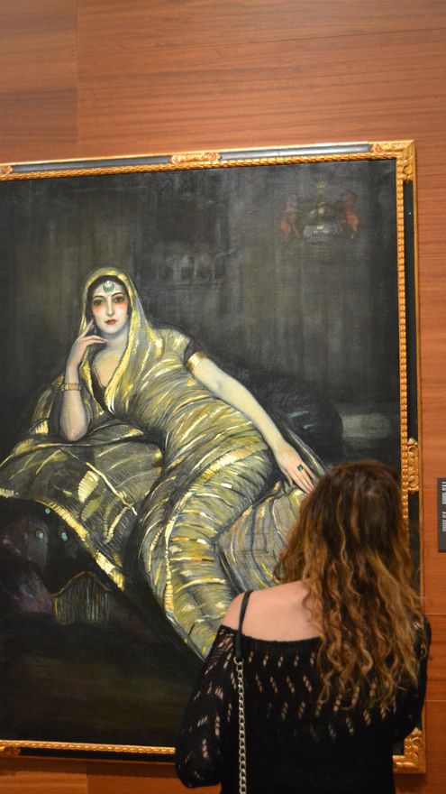 Primero, de cómo una cantante salerosa pero vulgar se convirtió en una princesa de un mundo que se esfumaba. De las paredes del Museo de Bellas Artes de Málaga cuelga la estampa imponente de una mujer enfundada en un sari verde oscuro. Decora su frente con una joya y tiene el contorno de los ojos tintado de un rojo intenso. Cubre el cabello con un velo, que cae hasta el escote, y mira intensamente al retratista mientras reposa sobre un diván.
